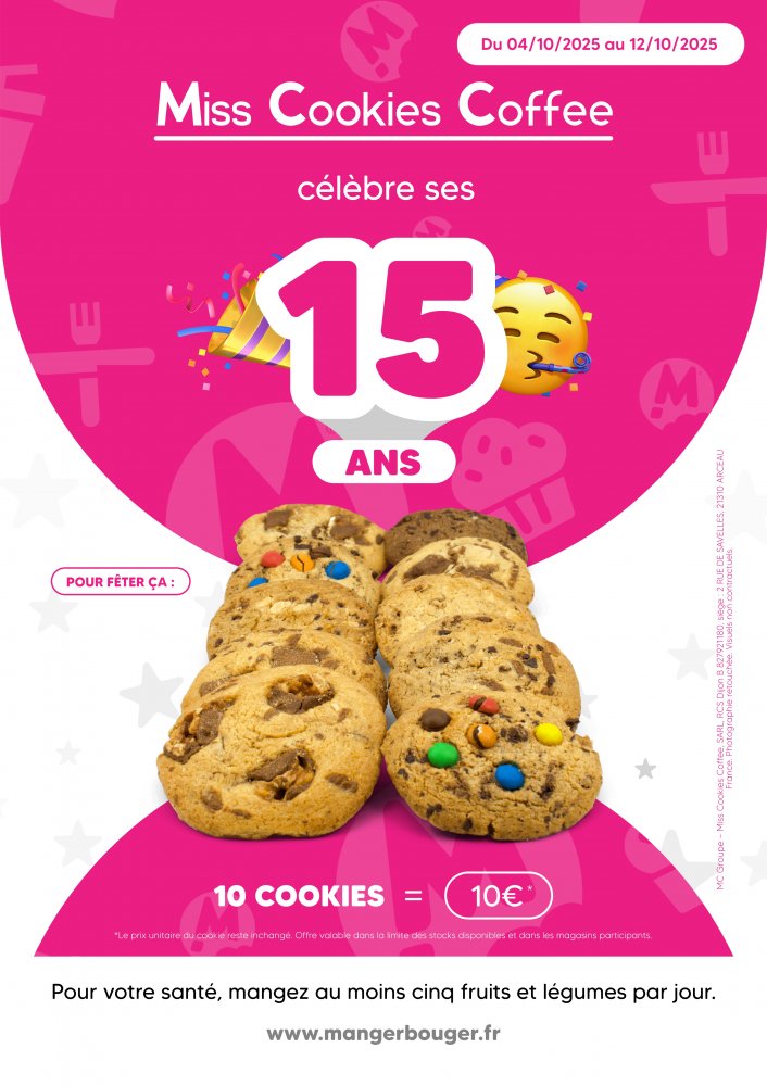Du 4 au 12 octobre 2025 Oui, vous avez bien lu ! Pour chaque boîte de 10 cookies, vous ne payez que 10€. Chaque boîte contient une variété de chaque cookie, pour vous faire découvrir ou redécouvrir tous nos classiques et nos créations préférées. Mais ce n’est pas tout… Miss Cookies Coffee aime gâter ses clients ! Ces tickets sont valables jusqu’au 31 octobre 2025 dans toutes nos boutiques. Une belle manière de prolonger la fête ! |